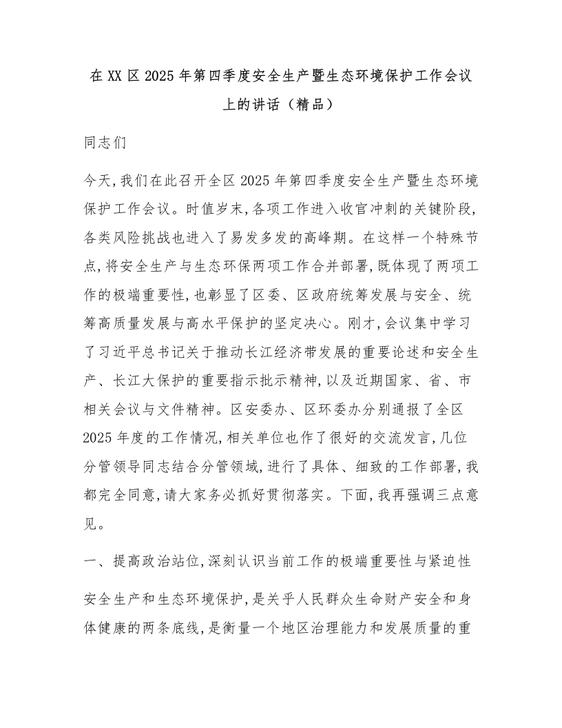 在XX区2025年第四季度安全生产暨生态环境保护工作会议上的讲话(精品)