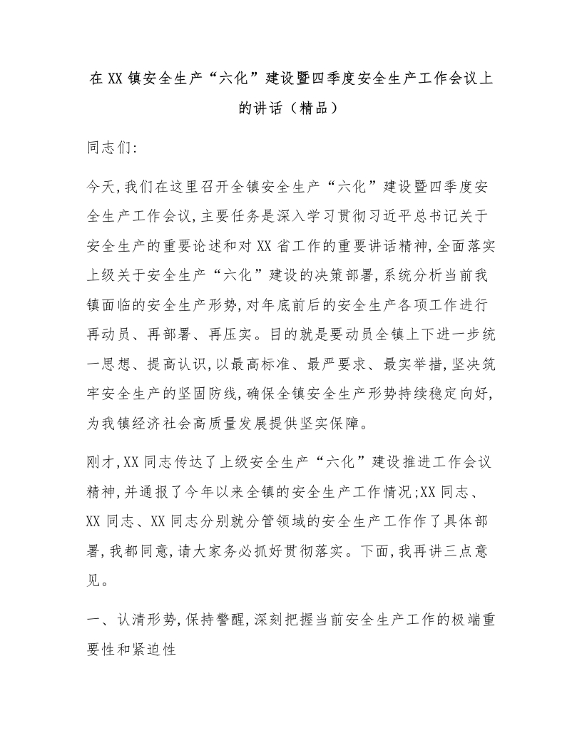 在XX镇安全生产“六化”建设暨四季度安全生产工作会议上的讲话(精品)