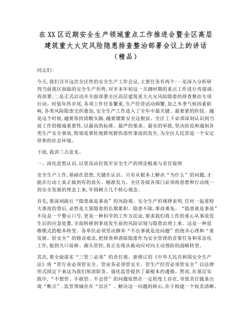在XX区近期安全生产领域重点工作推进会暨全区高层建筑重大火灾风险隐患排查整治部署会议上的讲话(精品)